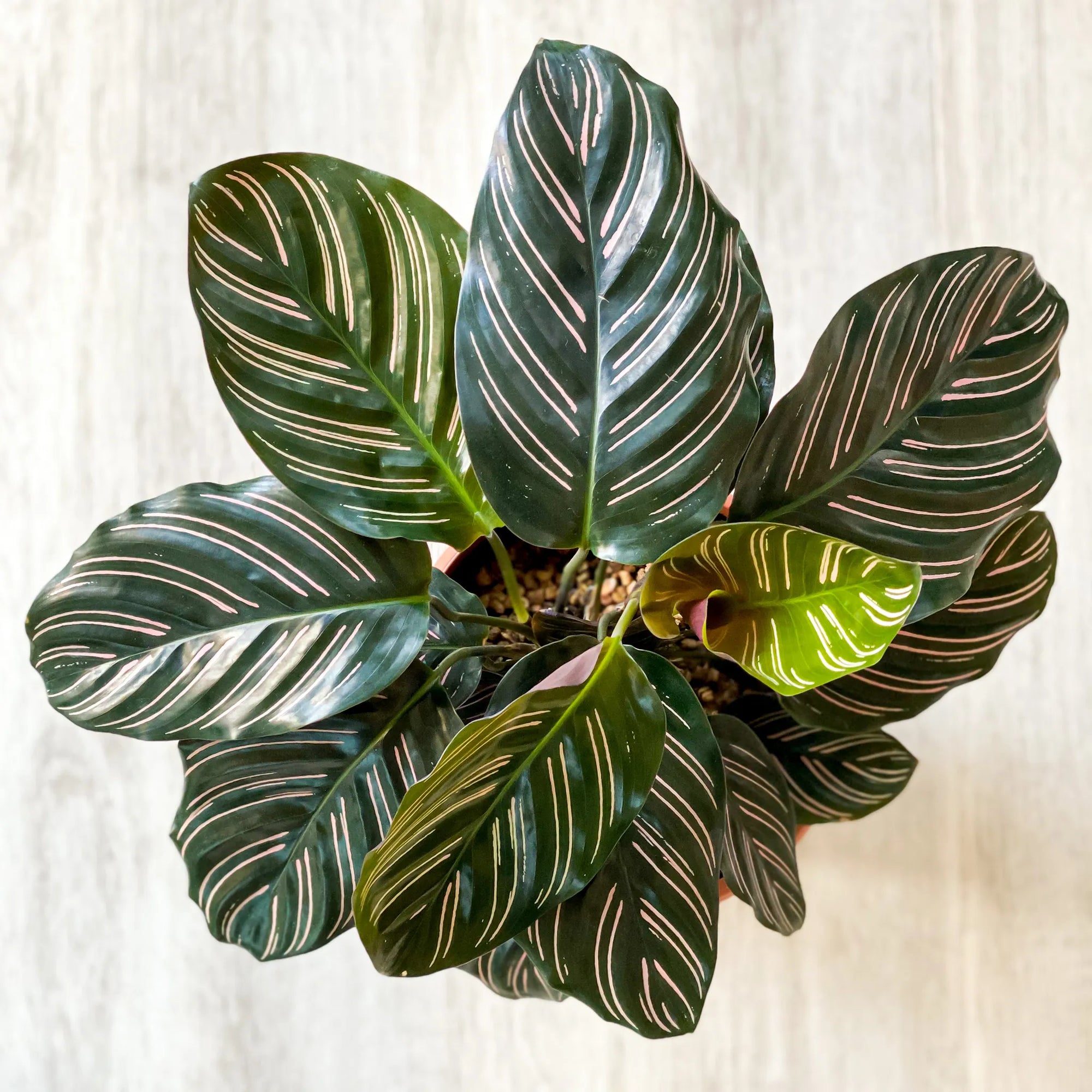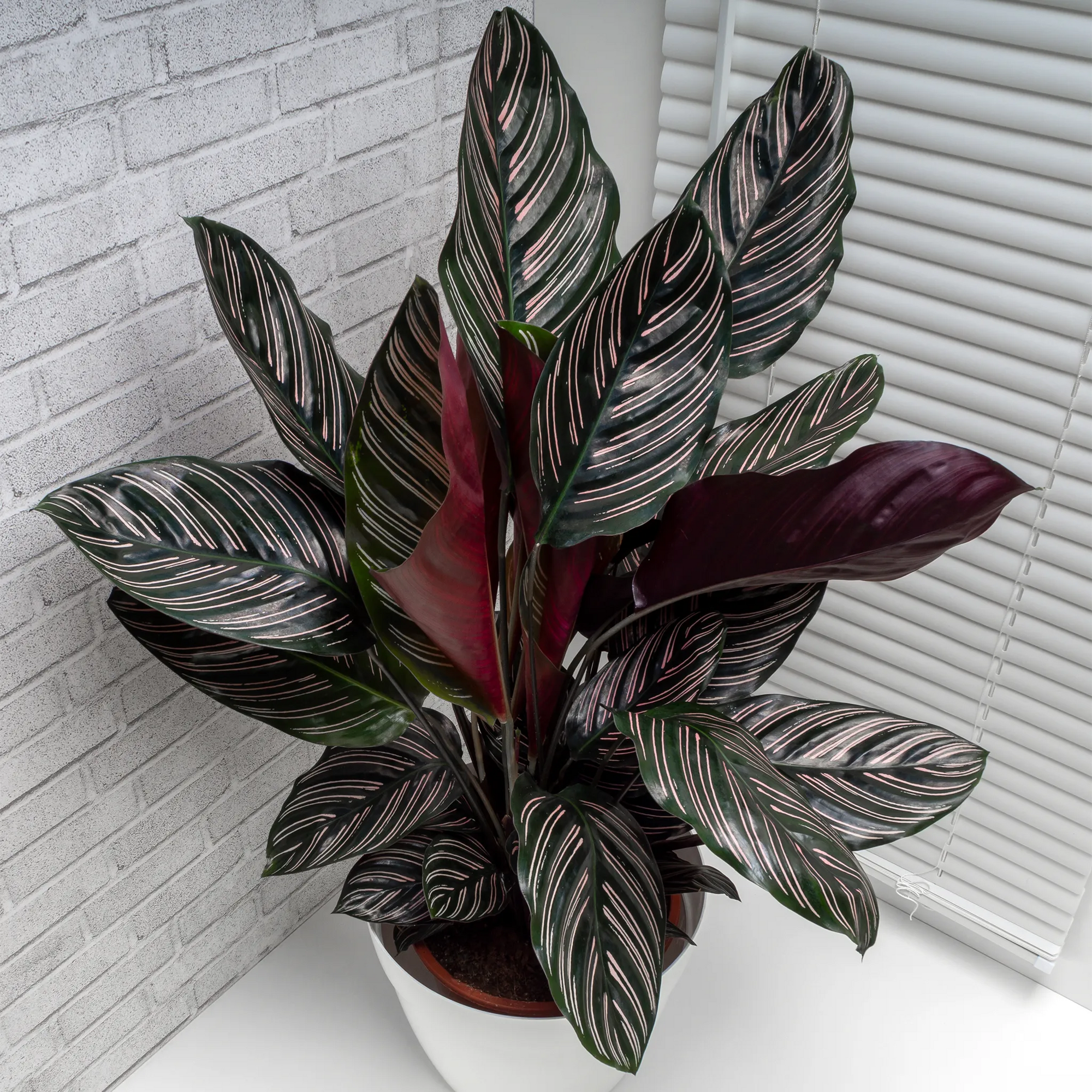 Calathea ornata, auch bekannt als Calathea mit Streifen, wird wegen ihrer glänzenden, dunkelgrünen Blätter geschätzt, die mit feinen rosa Linien verziert sind, die wie handgemalte Streifen wirken. Die Unterseiten der Blätter leuchten in tiefem Burgunderrot und erzeugen so einen eindrucksvollen Zweifarbeneffekt. Mit ihrem eleganten Erscheinungsbild passt diese Pflanze besonders gut in moderne Wohnräume, wo sie Eleganz und Farbkontrast hinzufügt. Wie andere Gebetspflanzen folgt ihr Laub einem nyktinastischen Rhythmus: Nachts klappt es nach oben, tagsüber breitet es sich wieder aus. Um ihre Blätter strahlend zu halten, benötigt sie gleichmäßig feuchte Erde, hohe Luftfeuchtigkeit und gefiltertes Licht.