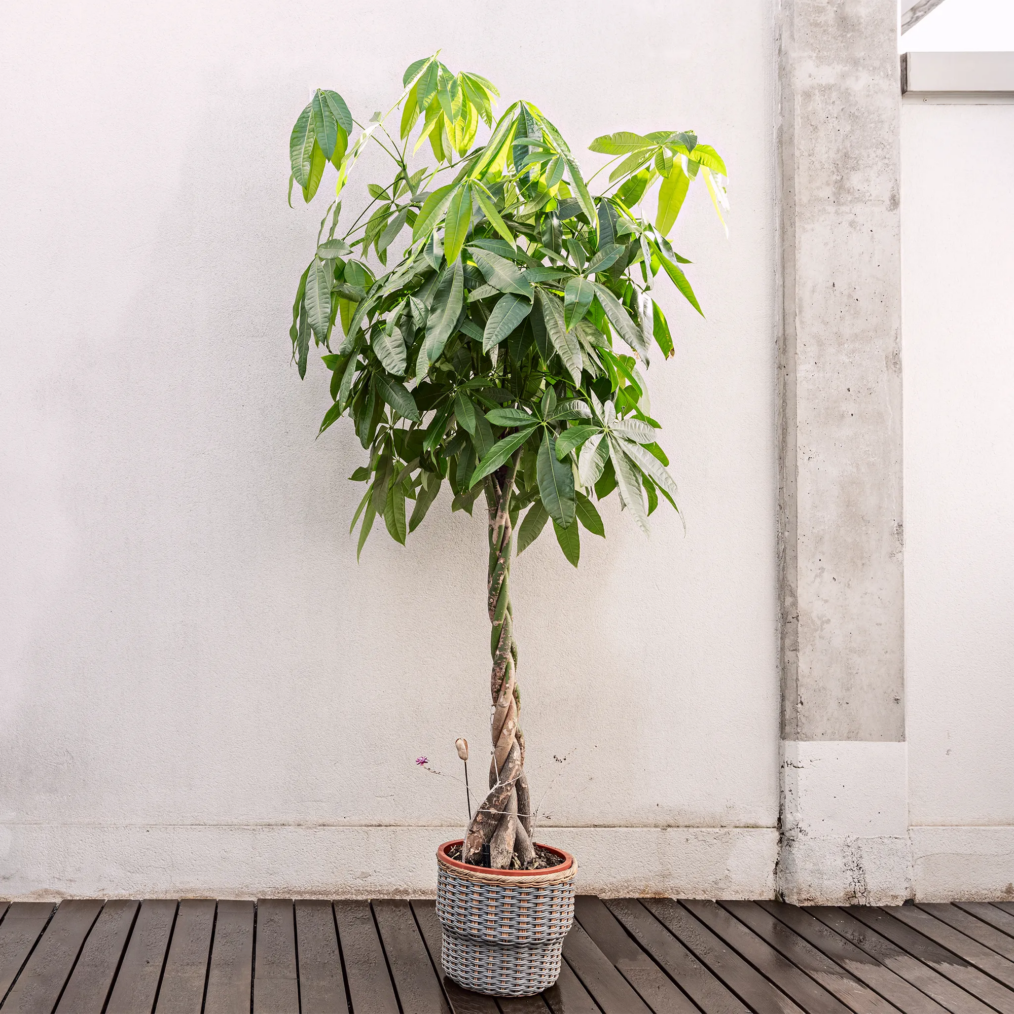 Pachira aquatica, allgemein bekannt als Geldbaum, ist eine tropische Zimmerpflanze, die sowohl wegen ihrer skulpturalen Form als auch wegen ihrer Symbolik für Glück und Wohlstand geschätzt wird. In sehr großer Größe wird sie zu einem beeindruckenden Mittelpunkt, oft mit geflochtenen Stämmen und einer üppigen Krone aus glänzenden, handförmigen Blättern. Robust und anpassungsfähig gedeiht sie bei hellem, indirektem Licht, mäßigem Gießen und normaler Raumluftfeuchtigkeit. Auch wenn sie im Innenraum selten blüht, macht ihre elegante Erscheinung und tierfreundliche Natur sie ideal für großzügige Wohnzimmer, Büros oder Empfangsbereiche.