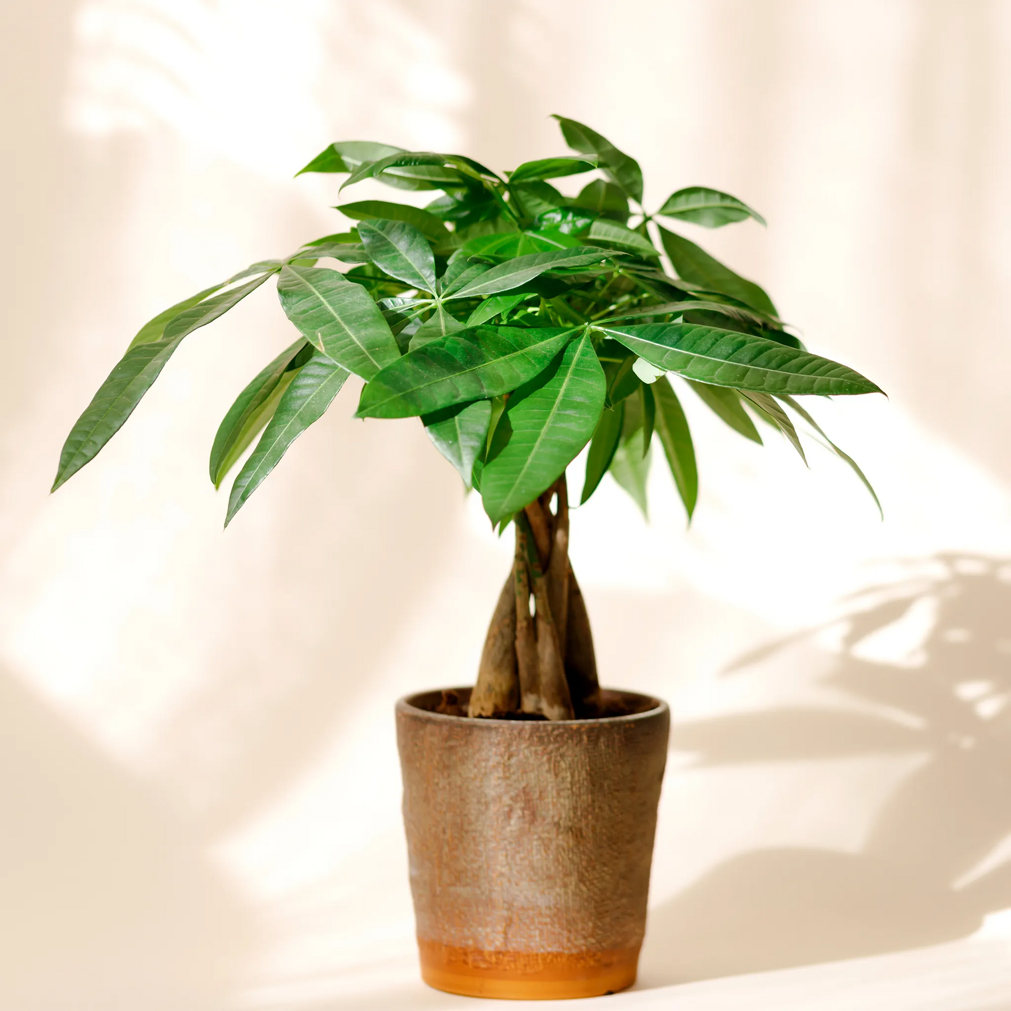 Pachira aquatica, allgemein bekannt als Geldbaum, ist eine tropische Zimmerpflanze, die für ihren geflochtenen Stamm und die üppige Krone glänzender grüner Blätter geschätzt wird. Sie gilt als Symbol für Wohlstand und Glück und ist ebenso dekorativ wie bedeutungsvoll. Kompakt und pflegeleicht passt dieses kleine Format perfekt auf Schreibtische, Regale oder Beistelltische und bringt Grün und Charme in jeden Raum. Tierfreundlich und robust gedeiht er bei hellem, indirektem Licht und mäßigem Gießen.