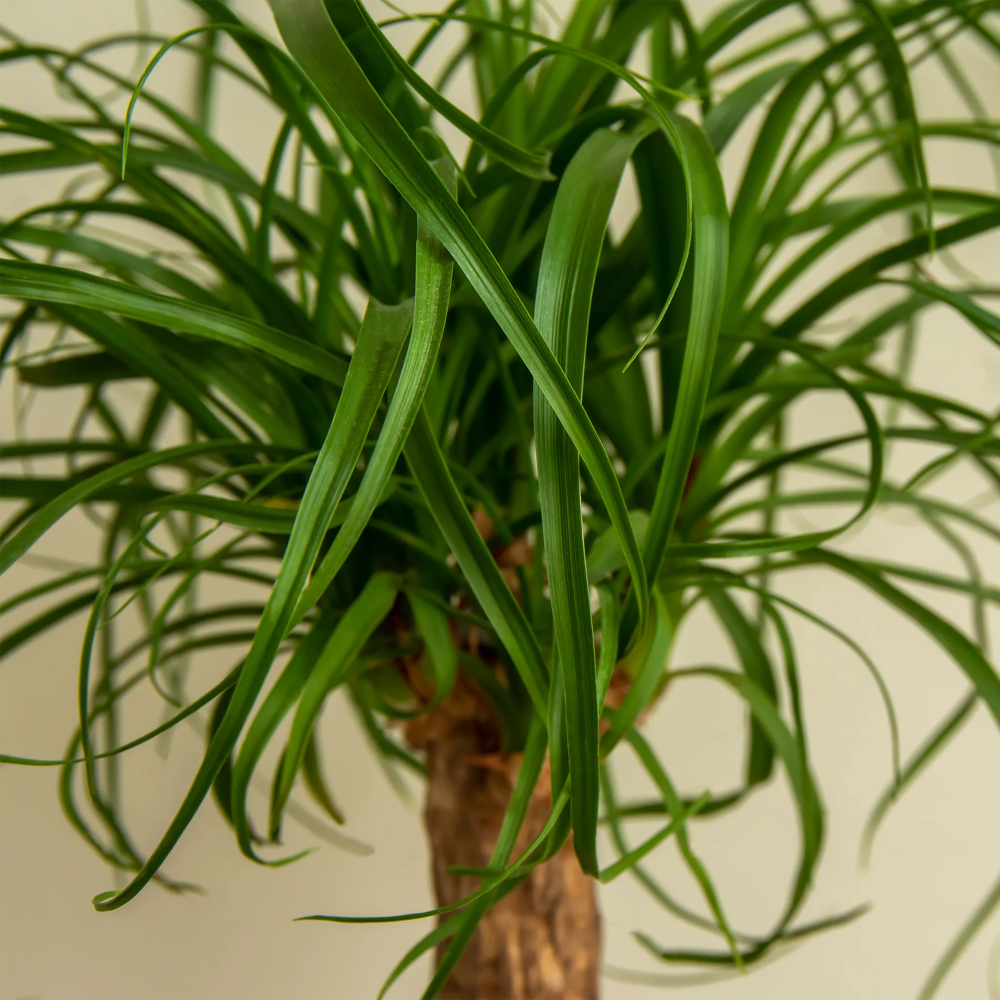Beaucarnea recurvata, auch bekannt als Elefantenfuß oder Flaschenbaum, ist eine widerstandsfähige und äußerst dekorative Pflanze. Sie ist leicht erkennbar an ihrem verdickten Stammfuß, der Wasser speichert, sowie an den langen, elegant herabhängenden Blättern, die wie ein Springbrunnen wirken. Obwohl sie umgangssprachlich oft als Palme bezeichnet wird, ist sie keine echte Palme, sondern ein sukkulentenverwandtes Gewächs mit hoher Trockenheitsresistenz. Geliefert in einem Ziertopf kommt sie direkt als skulpturales Designelement ins Haus und bringt Charakter und Grün, ohne dass ein Umtopfen nötig ist. Diese Art gedeiht bei viel Licht, verträgt auch etwas direkte Sonne und benötigt nur selten Wasser—ideal also für Pflanzenfreunde, die einen dramatischen Look mit minimalem Aufwand suchen.