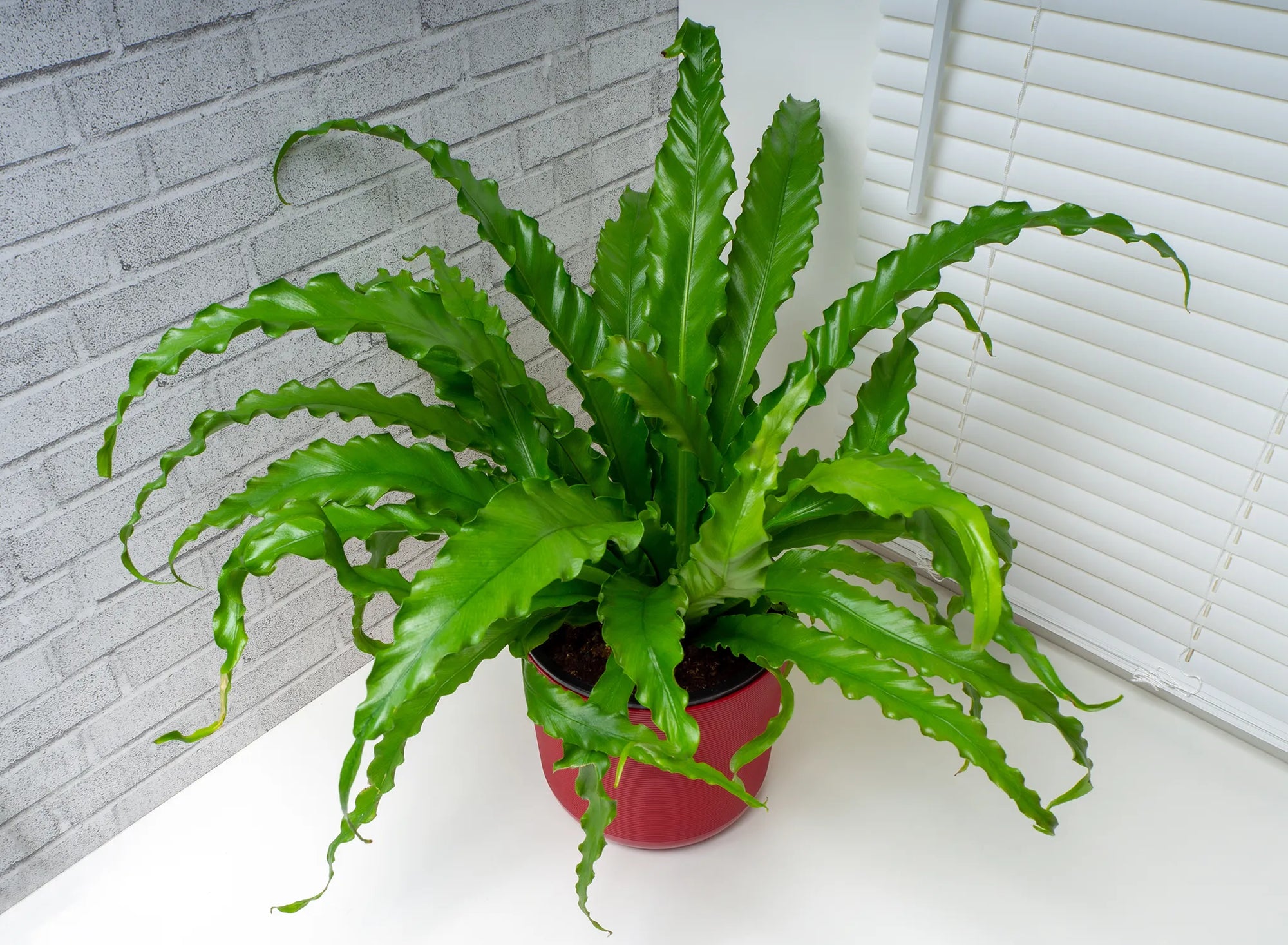 The Japanese bird’s-nest fern (Asplenium antiquum) is a highly decorative houseplant that adds a fresh, architectural touch to any interior. Known for its vibrant green, wavy fronds that grow in a circular rosette, it resembles a bird’s nest at its core, giving it its common name. Unlike many tropical plants, this fern does not flower, making its evergreen foliage the main attraction. It thrives in warm, humid environments and is particularly well-suited for homes where humidity is naturally higher, such as bathrooms. Easy to care for and forgiving, this fern is an excellent choice for both beginners and seasoned plant lovers. With its air-purifying qualities and lush appearance, the Japanese bird’s-nest fern is an ideal companion for creating a serene, pet-friendly green oasis indoors.