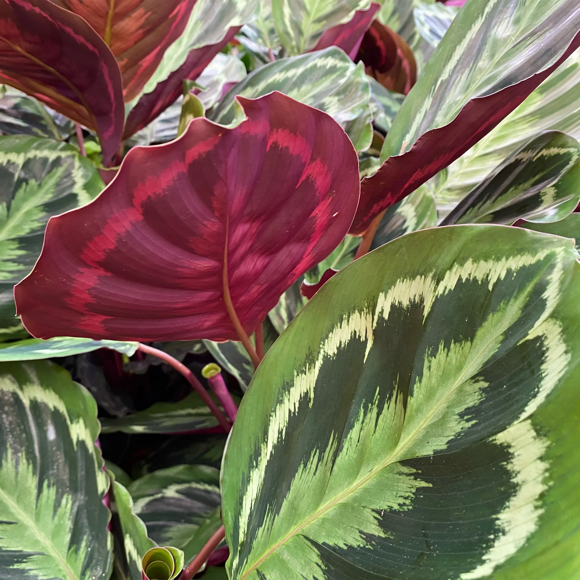 Calathea ‘Medallion’ ist eine der beliebtesten und bekanntesten Gebetspflanzen, geschätzt für ihr auffälliges Laub, das fast wie von Hand gemalt wirkt. Die breiten, runden Blätter zeigen ein tiefgrünes Zentrum, eingefasst von hellgrünen, federartigen Mustern und einem silbrigen Rand, während die Unterseiten ein dramatisches Burgunderrot offenbaren. Mit ihrem aufrechten, buschigen Wuchs ist sie ein markanter Dekorationsakzent in Wohnzimmern, Küchen oder Bädern mit gefiltertem Licht. Wie alle Gebetspflanzen falten sich die Blätter nachts zusammen und breiten sich tagsüber aus, was dem Raum eine rhythmische Lebendigkeit verleiht. Bei gleichmäßig feuchter Erde, hoher Luftfeuchtigkeit und weichem, indirektem Licht entwickelt sich die ‘Medallion’ zu einer zuverlässigen Mittelpunktpflanze.
