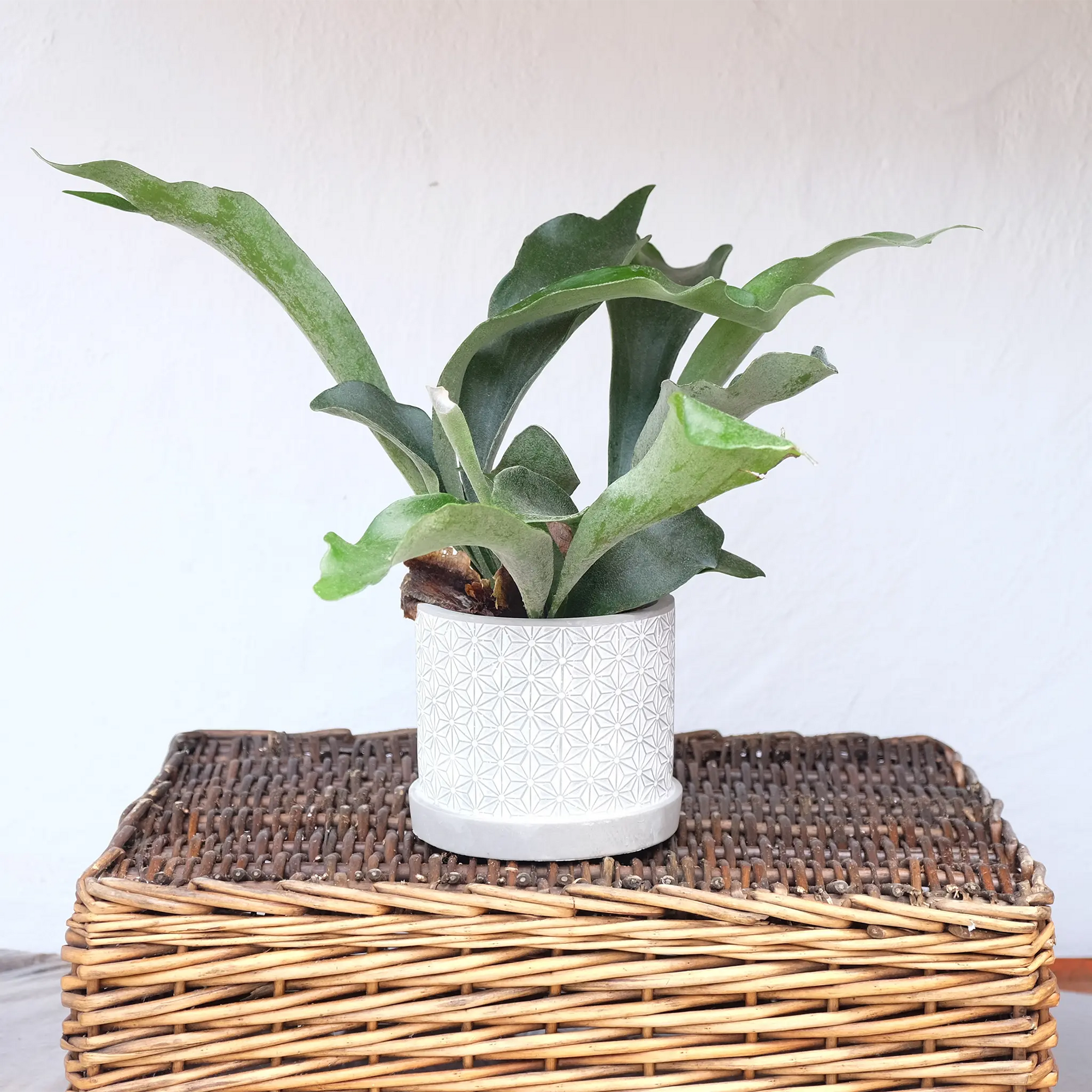 Platycerium bifurcatum, allgemein als Geweihfarn bekannt, ist ein außergewöhnlicher epiphytischer Farn aus Australien. Seine Wedel erinnern an Hirschgeweihe und verleihen ihm ein skulpturales, dramatisches Aussehen, das ihn klar von klassischen Farnen unterscheidet. Oft wird er auf Holzplatten aufgebunden oder in Hängeampeln kultiviert, wo er ohne Erde in gut belüfteten, feuchten Umgebungen gedeiht. Die Pflanze bildet zwei Arten von Wedeln: Schildwedel, die die Basis schützen und Wasser sowie Nährstoffe sammeln, und Geweihwedel, die ihre ikonische Form ausmachen. Bei hellem, indirektem Licht, regelmäßiger Befeuchtung und mäßigem Gießen wird er zu einem lebenden Kunstwerk im Zuhause.